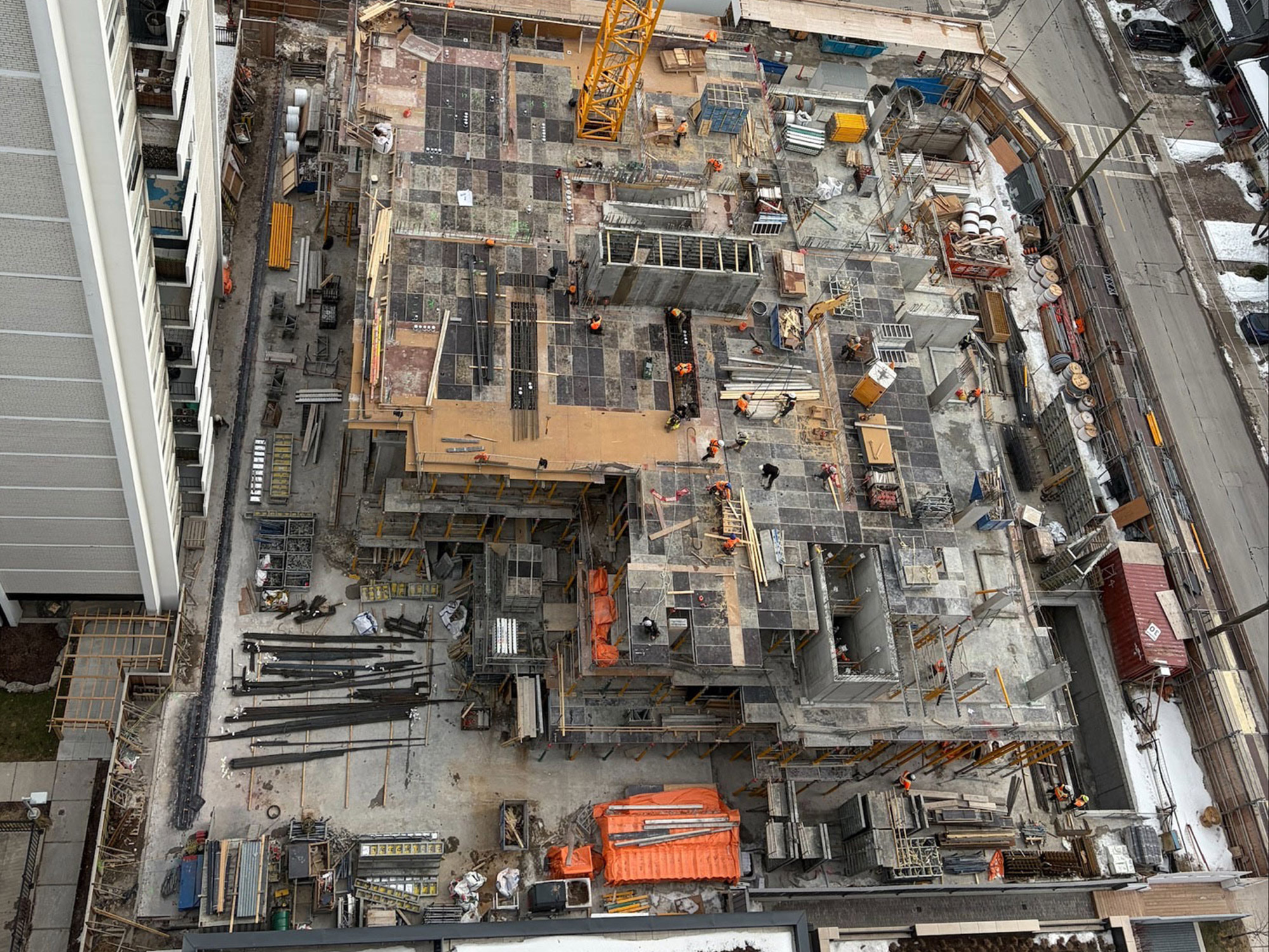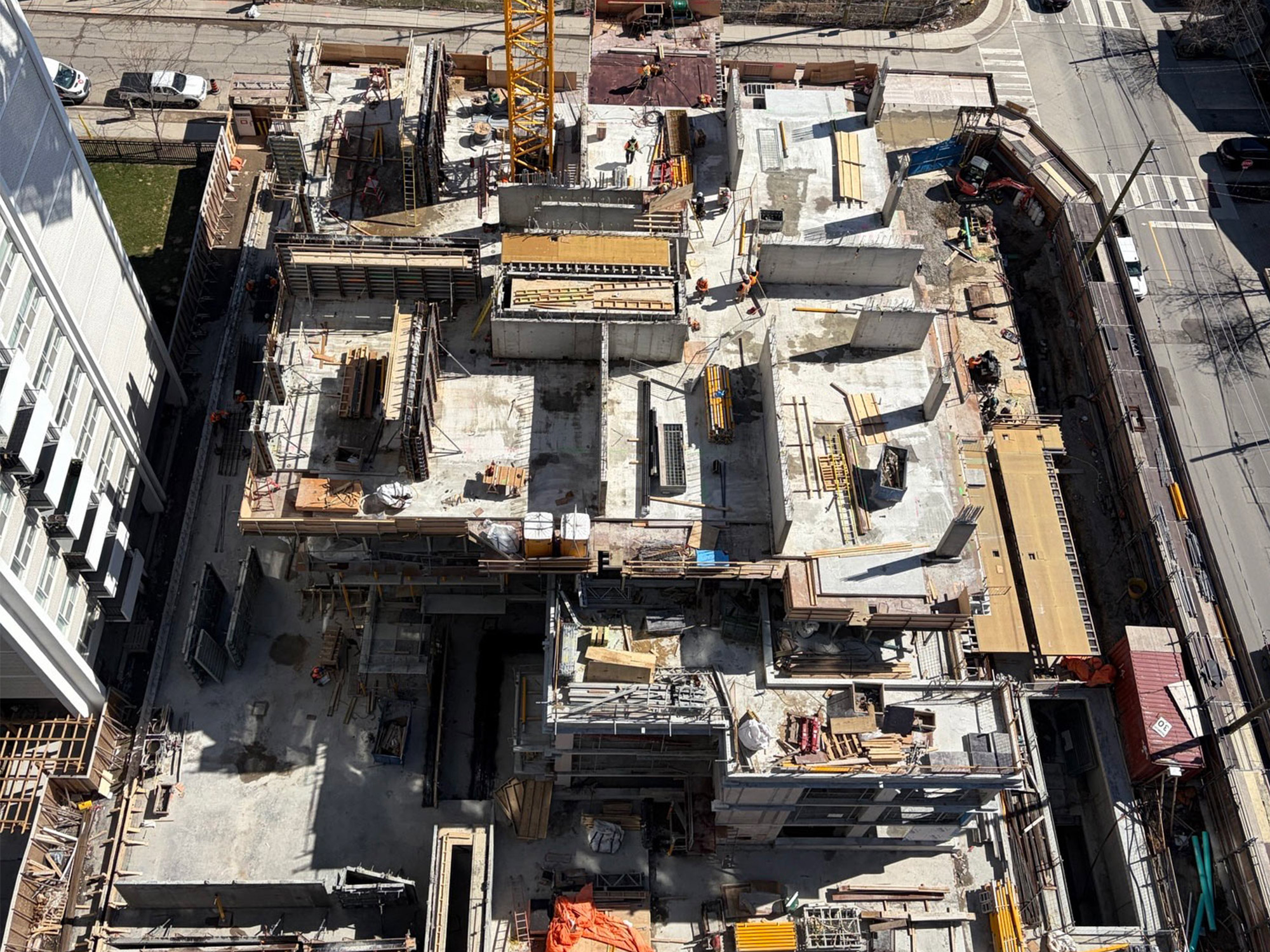 The three-storey podium structure has now been fully poured. Our team is currently pouring the fourth floor, marking the beginning of the tower’s vertical rise. With the podium complete and forming well underway for the upper floors, visitors to the site will begin to see the building’s true scale take shape. Mechanical and electrical rough-ins are advancing through the lower levels as we prepare for the next stages of construction in the coming months.